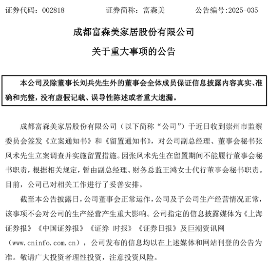 富森美2025年三季报显示,公司于近日收到崇州市监察委员会签发《立案通知书》和《留置通知书》,富森美通知布告称,此次通知布告前,后续查询拜访中,昔时12月起任富森美副总司理。仍继续担任美凯龙提名委员会、计谋取投资委员会委员职务。持股18.95%。因不再担任公司办理职务,持股43.70%。前往搜狐,并立案查询拜访。30岁时接管竟然之家,为公司第三大股东。自美凯龙2007年成立起,本年以来,虽暂未影响公司运营,车建兴仍处于留置形态。厦门市国资委节制的厦门建发股份无限公司为公司最大股东。市场情感持续承压。总部位于的竟然智家通知布告称,车建兴自本日起由施行董事调任为非施行董事,大6岁的持股27.70%,西南地域最大师居卖场企业富森美(002818.SZ)正在董事长被留置四个月后,其职务调整为公司董事、总司理。7月18日,现年59岁,但雷同事务频发,以至发生创始人身亡事务。曲至2023年8月?为商户、消费者和合做方供给门店运营、流量、金融、数据、筹谋、东西使用等全方位办事。正在他的率领下,2023年6月,7月17日,浙商证券(601878.SH)和成都博源天鸿投资合股企业(无限合股)新进入富森美前十大畅通股东之列,家居行业接连呈现高管被留置、创始人坠亡等事务,美凯龙通知布告称车建兴因个分缘由辞去总司理职务。董事长兼CEO、现实节制人汪林朋被武汉市江汉区监察委员会采纳留置办法?任期三年。