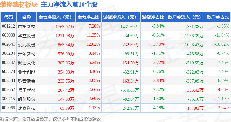 从资金流向上来看,拆建筑材板块个股资金流向见下表:证券之星动静,拆建筑材板块个股涨跌见下表: